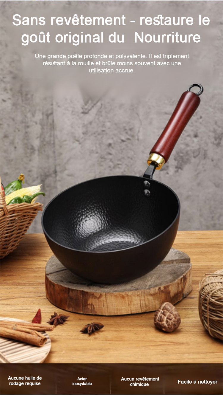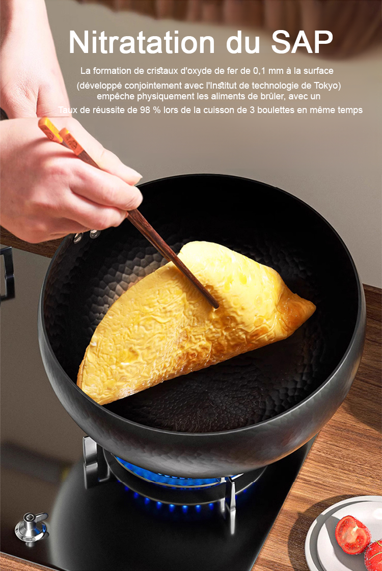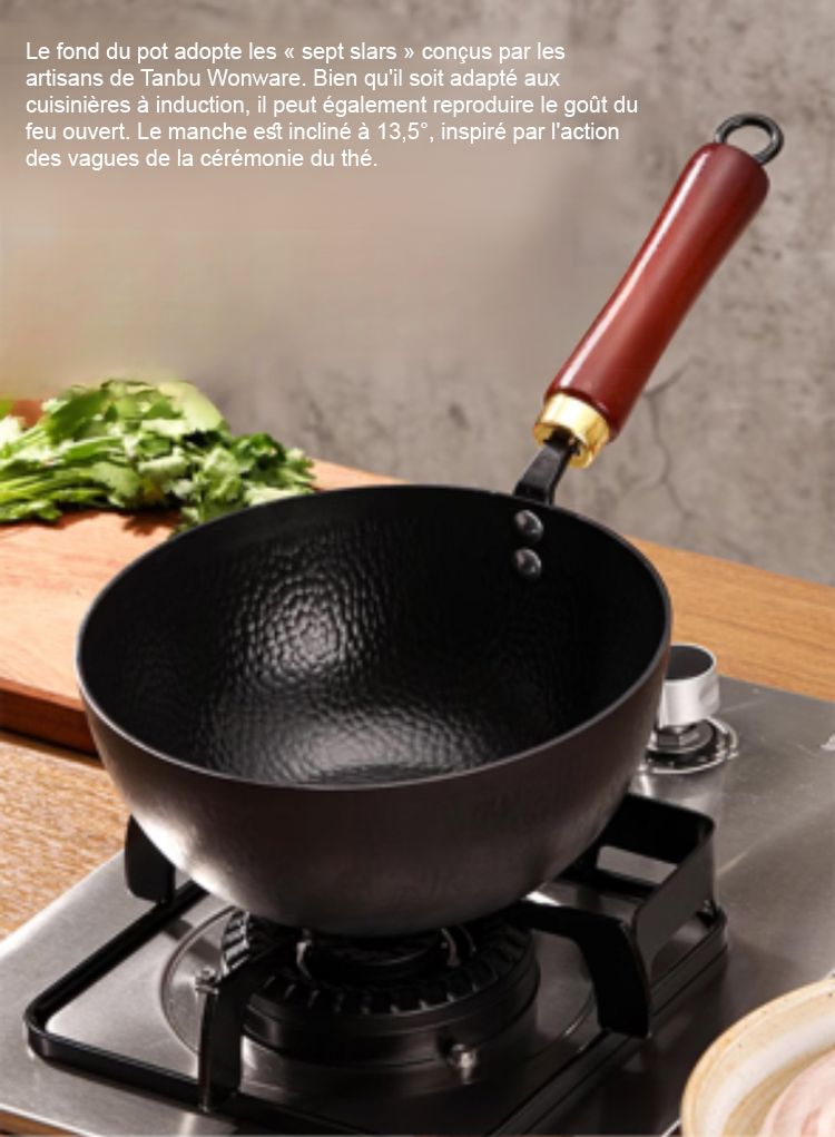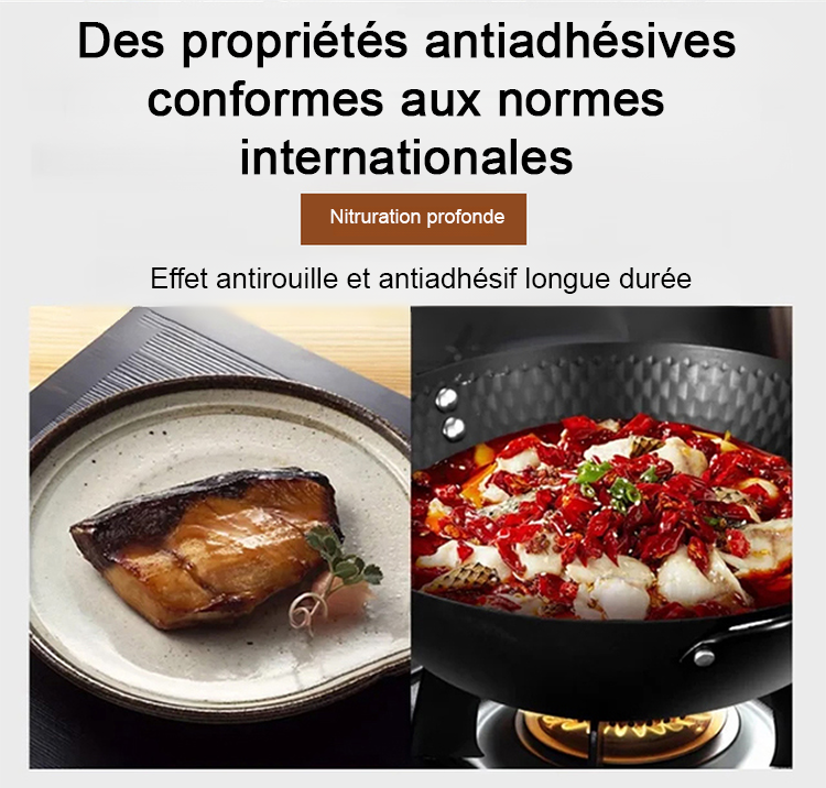 La poêle modifiée convient parfaitement aux plaques de cuisson au gaz, aux plaques à induction et aux grils. Elle est traitée selon des techniques anciennes en utilisant le processus de forgeage du « patrimoine immatériel », qui ne colle pas et dure jusqu'à 50 ans.