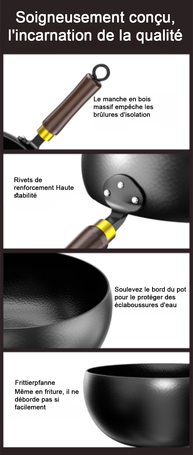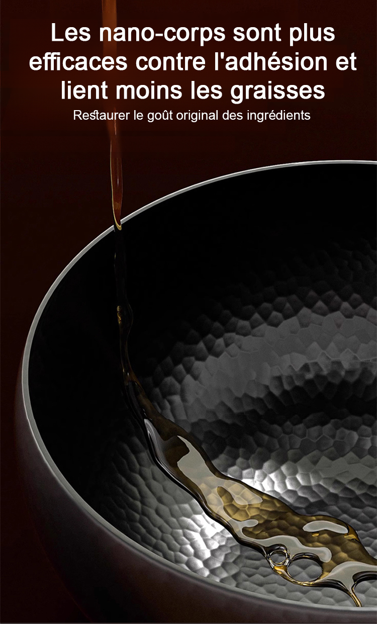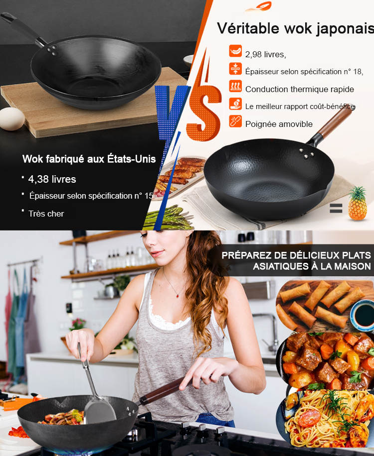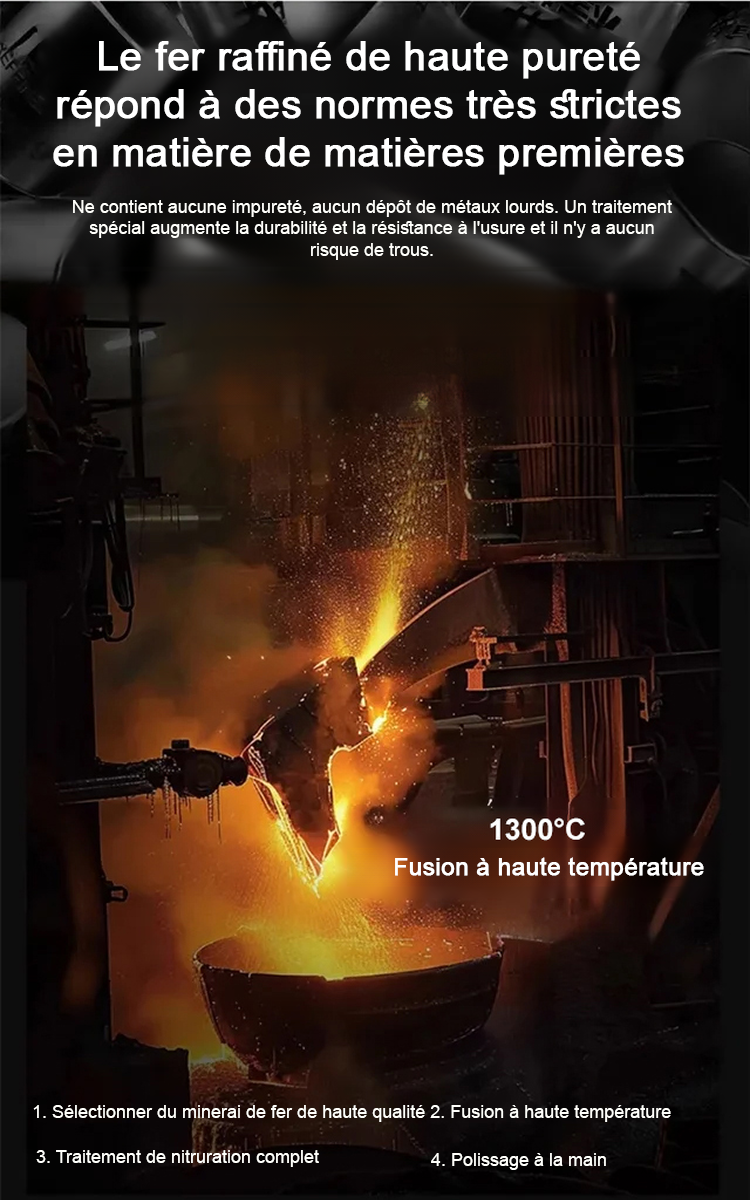 La poêle modifiée convient parfaitement aux plaques de cuisson au gaz, aux plaques à induction et aux grils. Elle est traitée selon des techniques anciennes en utilisant le processus de forgeage du « patrimoine immatériel », qui ne colle pas et dure jusqu'à 50 ans.